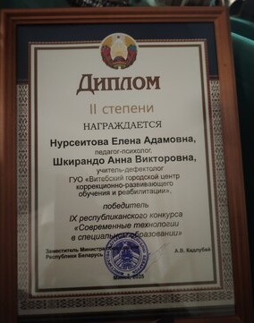 15 декабря 2025 года в городе Минске на базе государственного учреждения «Академия образования» состоялась защита конкурсной работы "Авторская технология работы с телесными сигналами детей с расстройствами аутистического спектра при организации коммуникативного взаимодействия". Работу представляли педагог-психолог Нурсеитова Е.А., учитель-дефектолог Шкирандо А.В.