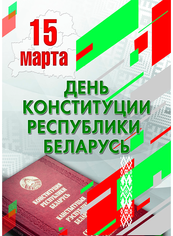 Конституция Беларуси была принята 15 марта 1994 года. Она впервые в истории белорусской государственности закрепила статус республики как унитарного демократического социального правового государства, установила принципы демократического строя, приоритет прав и свобод человека, главенство международного права. Кроме того, Конституцией впервые в истории страны в системе высших органов государственной власти предусмотрена должность Президента Республики Беларусь. Этот документ заложил прочный правовой фундамент независимости, реализовал стремление белорусского народа быть полноправным хозяином на родной земле. 15 марта ежегодно отмечается государственный праздник - День Конституции Республики Беларусь.