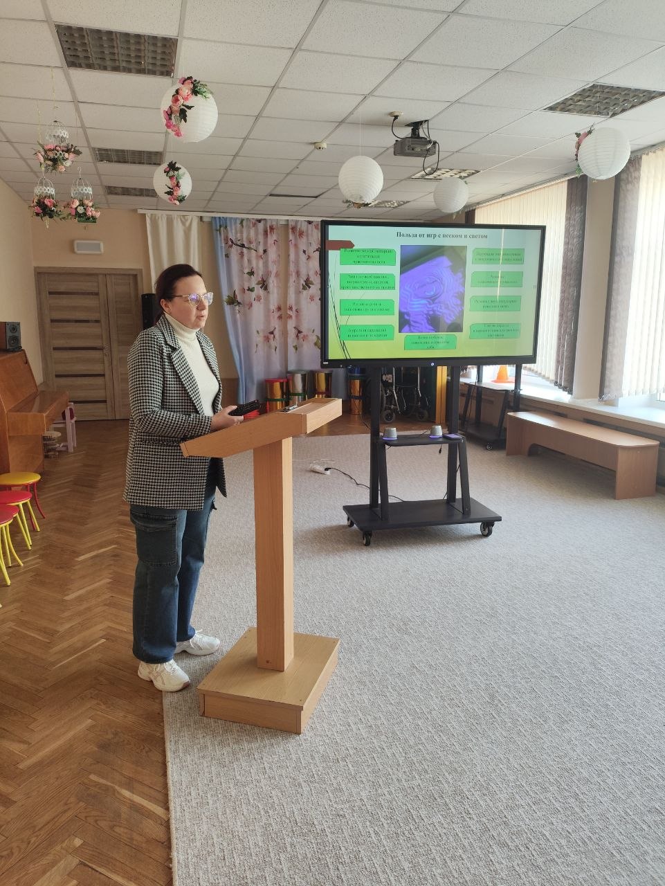 Жанович О.А., учитель-дефектолог ГУО «Детский сад №39 г. Витебска «Буратино» продемонстрировала опыт использования светового песочного стола в коррекционной работе с детьми с общим недоразвитием речи.